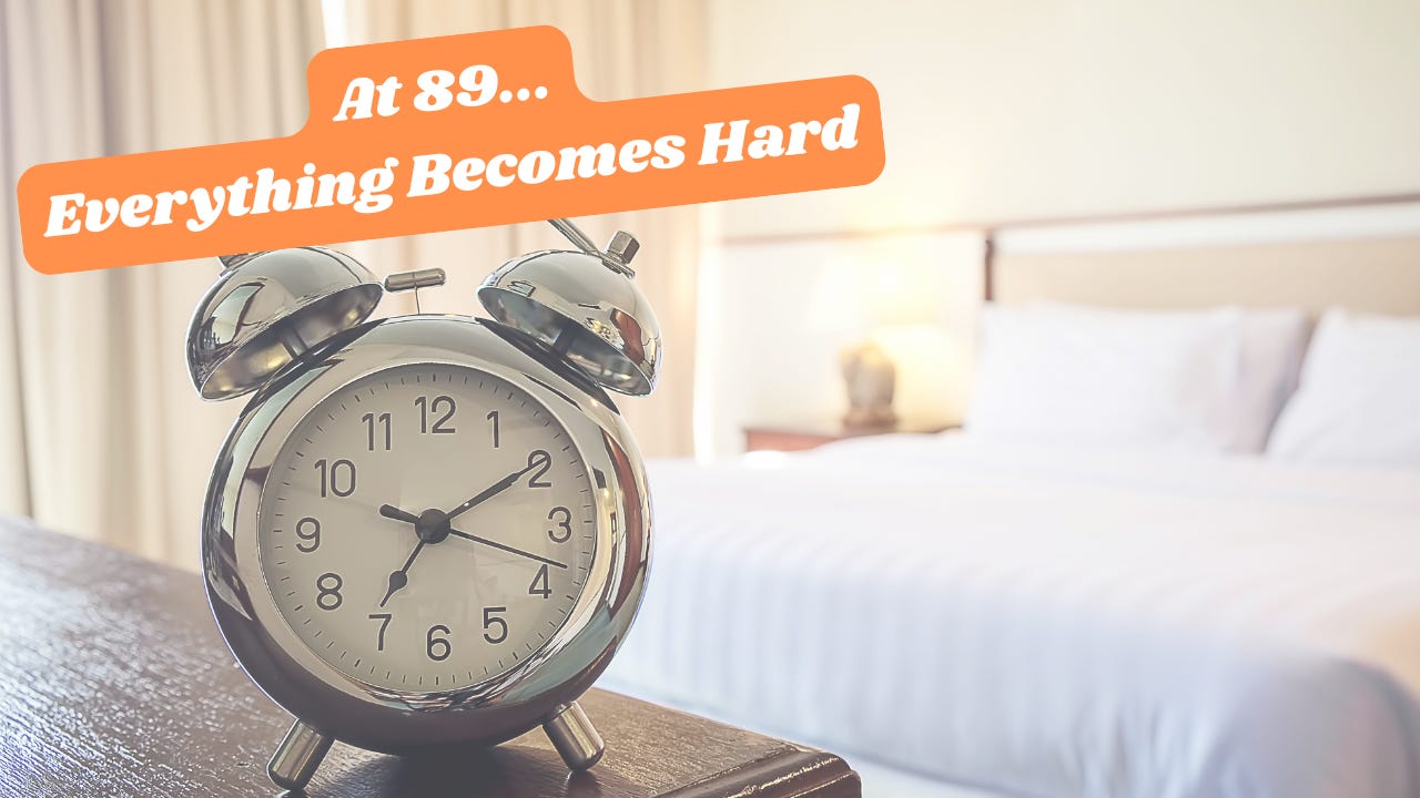 When an elder loses the strength and ability to sit up from a night’s sleep, that means someone; a family member or caregiver, must physically hoist them up. Because remember, at 89 everything becomes hard.