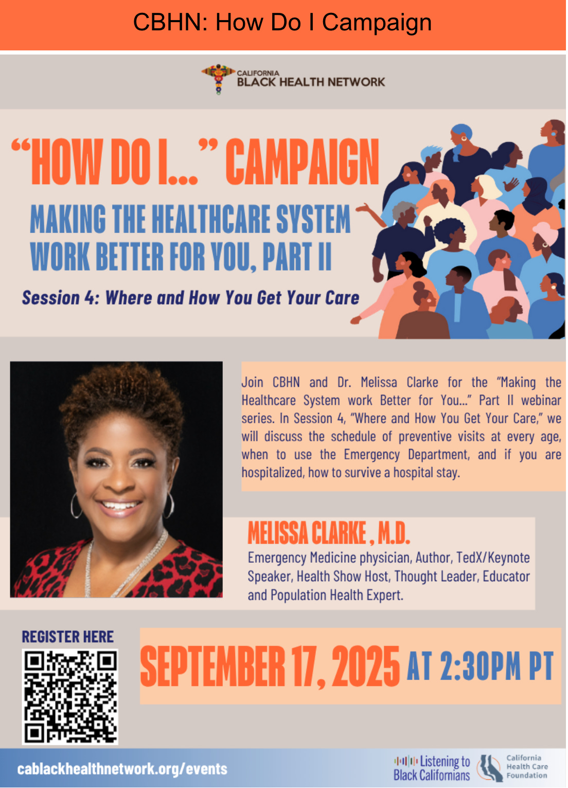 Join CBHN and Dr. Melissa Clarke for the “Making the Healthcare System work Better for You...” Part II webinar series. In Session 4, “Where and How You Get You Care”, participants will learn about the schedule of preventative visits at every age, when yo use the Emergency Department, and if you are hospitalized, how to survive a hospital stay. Dr. Melissa Clarke is the author of “Excuse Me, Doctor. I’ve got WHAT?!”, a roadmap for how to be a smart healthcare consumer and understanding why now it is more important than ever to take control of your health and healthcare. Dr. Clarke is also a TedX/Keynote Speaker, Health Show Host, Thought Leader, Physician, Educator and Population Health Expert.